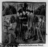 Parigi, Bibliothèque Nationale de France, Fr. 230, f. 264r. Il copista del manoscritto è P. Droulin. I cavalieri Templari vengono arsi sul rogo.