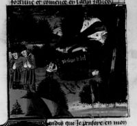 Parigi, Bibliothèque Nationale de France, Fr. 230, f. 263r. Il copista del manoscritto è P. Droulin. Papa Bonifacio VIII giace a letto morente, con le mani consumate fino ai polsi.