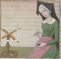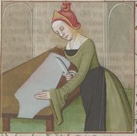 Parigi, Bibliothèque Nationale de France, Fr. 599, f. 77v. Il copista del manoscritto è Johannes Michel. Paolina taglia un pezzo di stoffa.