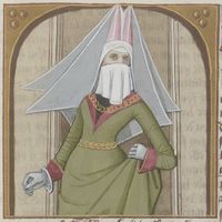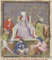 Parigi, Bibliothèque Nationale de France, Fr. 599, f. 93v. Il copista del manoscritto è Johannes Michel. La regina Giovanna I in trono si rivolge a un servitore.