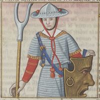 Parigi, Bibliothèque Nationale de France, Fr. 599, f. 82v. Il copista del manoscritto è Johannes Michel. Triaria armata di una forca e uno scudo.