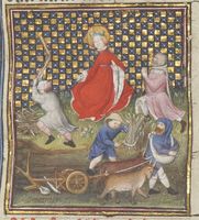Parigi, Bibliothèque Nationale de France, Fr. 12420, f. 12r. La dea Cerere insegna ai contadini ad arare, mietere e seminare, e riceve gli omaggi di un uomo inginocchiato.