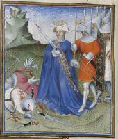 Parigi, Bibliothèque Nationale de France, Fr. 598, f. 74v. La regina Tamiri decapita il cadavere di Ciro, mentre intorno infuria la battaglia.