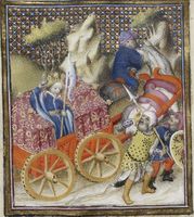 Parigi, Bibliothèque Nationale de France, Fr. 598, f. 109v. Beronice insegue gli assassini del figlio su un carro da guerra.