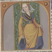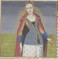 Parigi, Bibliothèque Nationale de France, Fr. 599, f. 39v. Il copista del manoscritto è Johannes Michel. Nicaula, regina d'Etiopia, con uno scettro.