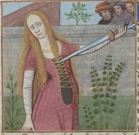 Parigi, Bibliothèque Nationale de France, Fr. 599, f. 44v. Il copista del manoscritto è Johannes Michel. Il supplizio di Leena.