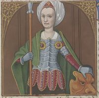 Parigi, Bibliothèque Nationale de France, Fr. 599, f. 43v. Il copista del manoscritto è Johannes Michel. Tamiri, regina degli Sciti, con lancia e scudo.