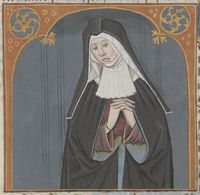 Parigi, Bibliothèque Nationale de France, Fr. 599, f. 50v. Il copista del manoscritto è Johannes Michel. Artemisia vestita a lutto.