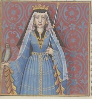 Parigi, Bibliothèque Nationale de France, Fr. 599, f. 54r. Il copista del manoscritto è Johannes Michel. La regina Olimpiade con uno scettro e un falcone.