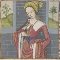 Parigi, Bibliothèque Nationale de France, Fr. 599, f. 48r. Il copista del manoscritto è Johannes Michel. Megulia Dotata con un falcone.