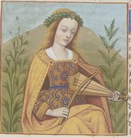 Parigi, Bibliothèque Nationale de France, Fr. 599, f. 29r. Il copista del manoscritto è Johannes Michel. Cassandra suona la cetra.