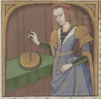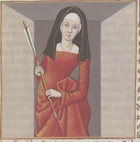 Parigi, Bibliothèque Nationale de France, Fr. 599, f. 30r. Il copista del manoscritto è Johannes Michel. Elena con una freccia ed una mela.