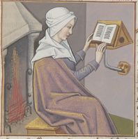 Parigi, Bibliothèque Nationale de France, Fr. 599, f. 34r. Il copista del manoscritto è Johannes Michel. Penelope, moglie di Ulisse, legge un libro.