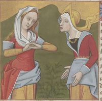 Parigi, Bibliothèque Nationale de France, Fr. 599, f. 24v. Il copista del manoscritto è Johannes Michel. Argia, moglie di Polinice, indossa una veste per andare alla ricerca del marito.