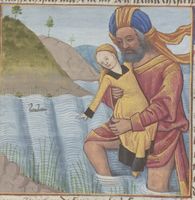 Parigi, Bibliothèque Nationale de France, Fr. 599, f. 33r. Il copista del manoscritto è Johannes Michel. La piccola Camilla viene portata attraverso il fiume Amaseno dal padre Metabo.
