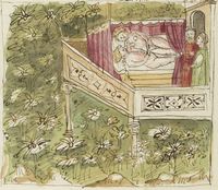 Parigi, Bibliothèque Nationale de France, It. 63, f. 148r. Il copista del manoscritto, datato 10 ottobre 1427, è Ludovico di Salvestro Ceffini. Lo spettro di Lorenzo appare a Lisabetta mentre dorme; la fanciulla piange sulla pianta di basilico.