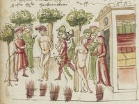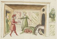 Parigi, Bibliothèque Nationale de France, It. 63, f. 155v. Il copista del manoscritto, datato 10 ottobre 1427, è Ludovico di Salvestro Ceffini. Il marito di Salvestra trova la moglie nel letto con accanto il corpo di Girolamo.