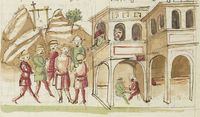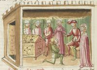 Parigi, Bibliothèque Nationale de France, It. 63, f. 196v. Il copista del manoscritto, datato 10 ottobre 1427, è Ludovico di Salvestro Ceffini. Un servo si reca da Cisti fornaio con un fiasco per comprare del vino.