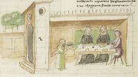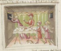 Parigi, Bibliothèque Nationale de France, It. 63, f. 188v. Il copista del manoscritto, datato 10 ottobre 1427, è Ludovico di Salvestro Ceffini. Federigo degli Alberighi invita a pranzo monna Giovanna e le fa servire come pasto il proprio falcone.