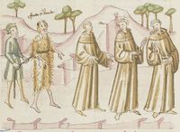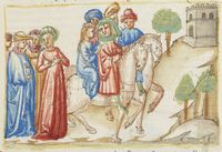 Parigi, Bibliothèque Nationale de France, It. 63, f. 196r. Il copista del manoscritto, datato 10 ottobre 1427, è Ludovico di Salvestro Ceffini. Durante il viaggio madonna Oretta viene invitata a salire a cavallo da uno dei cavalieri della compagnia.