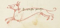 Parigi, Bibliothèque Nationale de France, It. 63, f. 156v. Il copista del manoscritto, datato 10 ottobre 1427, è Ludovico di Salvestro Ceffini. Un cane in corsa, in corrispondenza del richiamo "le disse per Dio".