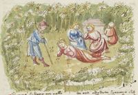 Parigi, Bibliothèque Nationale de France, It. 63, f. 165r. Il copista del manoscritto, datato 10 ottobre 1427, è Ludovico di Salvestro Ceffini. Cimone osserva Efigenia addormentata in un prato insieme ad altre fanciulle del suo seguito.