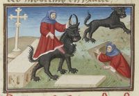 Parigi, Bibliothèque Nationale de France, Fr. 239, f. 236v. Buffalmacco, travestito con una pelliccia e una maschera, chinatosi a quattro zampe fa salire Simone sul suo dorso; poco dopo Buffalmacco getta il medico in una fossa fetida.
