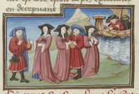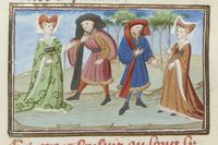 Parigi, Bibliothèque Nationale de France, Fr. 239, f. 275v. Dianora conversa con Ansaldo, chiedendo un giardino fiorito come pegno d'amore; la donna ritorna da suo marito dopo che Ansaldo ha rinunciato a lei.