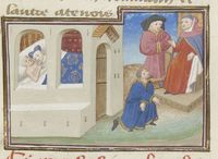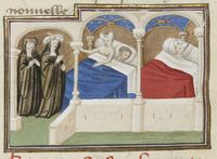 Parigi, Bibliothèque Nationale de France, Fr. 239, f. 273r. Gentile Carisendi salva Catalina dalla tomba dove ella era stata riposta perché creduta morta; Gentile affida la donna alla propria madre affinché sia curata.