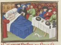 Parigi, Bibliothèque Nationale de France, Fr. 239, f. 250r. Il medico Simone cura Calandrino dalla finta gravidanza; grazie alla ricompensa il medico e gli amici di Calandrino si concedono un pranzo.