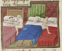 Parigi, Bibliothèque Nationale de France, Fr. 239, f. 256v. Durante la notte Pinuccio si infila nel letto della giovane figlia dell'oste, mentre la moglie dell'oste per errore si corica accanto ad Adriano.