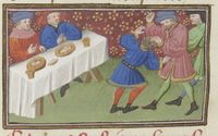 Parigi, Bibliothèque Nationale de France, Fr. 239, f. 222v. Bruno e Buffalmacco si dividono il maiale che hanno rubato a Calandrino; un uomo offre da bere a Calandrino dopo che questi ha mangiato le gallette amare.