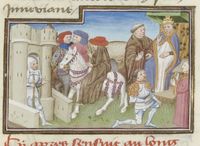 Parigi, Bibliothèque Nationale de France, Fr. 239, f. 261v. Giosefo e Melisso vengono condotti al cospetto di Salomone; due donne cuciono un cadavere in un sudario (?).