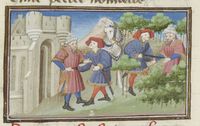 Parigi, Bibliothèque Nationale de France, Fr. 239, f. 251v. Fortarrigo, con indosso solo una camicia, accusa Cecco Angiolieri di averlo derubato, istigando dei contadini a fermarlo.