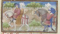 Parigi, Bibliothèque Nationale de France, Fr. 239, f. 170r. Madonna Oretta accetta il passaggio e la compagnia di un cavaliere; annoiata dall'uomo, Oretta si fa aiutare a smontare dal cavallo.