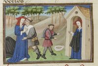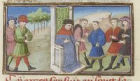 Parigi, Bibliothèque Nationale de France, Fr. 239, f. 212v. Sulla destra, il banchiere Guasparruolo presta 200 fiorini a Gulfardo; a sinistra, Gulfardo consegna il denaro ad Ambrogia.