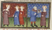 Parigi, Bibliothèque Nationale de France, Fr. 239, f. 175r. Michele Scalza fa una scommessa con Neri Vannini; Michele difende le proprie argomentazioni dinanzi a Piero di fiorentino, eletto arbitro della contesa, ed alla sua compagnia.