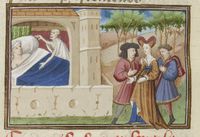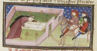 Parigi, Bibliothèque Nationale de France, Fr. 239, f. 209v. I due amici Tingoccio e Meuccio corteggiano monna Mita; dopo esser morto, Tingoccio appare a Meuccio nella sua stanza.