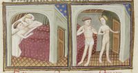 Parigi, Bibliothèque Nationale de France, Fr. 239, f. 185v. Monna Tessa dorme con il marito Gianni Lotteringhi; la donna convince il marito che sia stato un fantasma a bussare alla porta della camera.