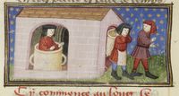 Parigi, Bibliothèque Nationale de France, Fr. 239, f. 187v. Il marito di Peronella entra nella botte per pulirla; l'uomo si fa convincere dalla moglie a trasportare la botte a casa di Giannello.