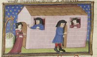 Parigi, Bibliothèque Nationale de France, Fr. 239, f. 193v. Arimino, travestito da prete, ascolta la confessione della moglie; durante la notte l'uomo monta la guardia davanti alla porta, mentre l'amante entra nella casa dal tetto.