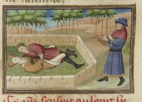 Parigi, Bibliothèque Nationale de France, Fr. 239, f. 191v. Tofano chiude la moglie Ghita fuori casa, così la donna richiama la sua attenzione gettando una pietra nel pozzo; per ripicca la donna chiude a sua volta il marito fuori casa.