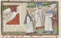 Parigi, Bibliothèque Nationale de France, Fr. 239, f. 219r. Il parroco riceve la visita del vescovo di Fiesole, mentre nel suo letto si trova la serva Catuzza.