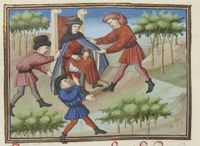 Parigi, Bibliothèque Nationale de France, Fr. 239, f. 221r. Due uomini (Ribi e Matteuzzo?) distraggono il giudice con una contesa mentre un terzo gli tira giù le braghe.