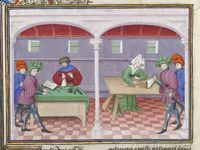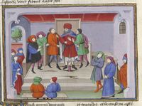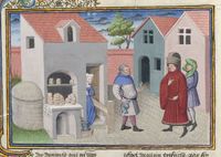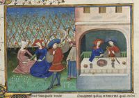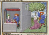 Parigi, Bibliothèque de l'Arsenal, 5070, f. 223v. Il copista del manoscritto è Guillebert de Mets. Il fornaio Cisti offre il suo vino a messer Geri Spina e all'ambasciatore del Papa.
