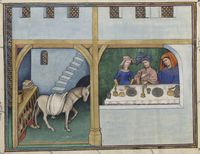 Parigi, Bibliothèque de l'Arsenal, 5070, f. 215v. Il copista del manoscritto è Guillebert de Mets. L'asino calpesta le dita dell'amante nascosto sotto la stia del pollame; Pietro di Vinciolo siede a tavola con la moglie e l'amante di lei.