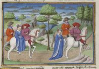 Parigi, Bibliothèque de l'Arsenal, 5070, f. 222r. Il copista del manoscritto è Guillebert de Mets. Madonna Oretta accetta il passaggio e la compagnia di un cavaliere; annoiata dall'uomo, Oretta scende dal cavallo.