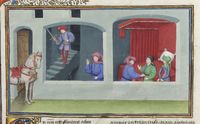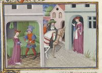 Parigi, Bibliothèque de l'Arsenal, 5070, f. 254v. Il copista del manoscritto è Guillebert de Mets. Arimino, travestito da prete, ascolta la confessione della moglie; di notte l'uomo monta la guardia davanti alla porta di casa.