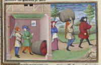 Parigi, Bibliothèque de l'Arsenal, 5070, f. 246v. Il copista del manoscritto è Guillebert de Mets. Il marito di Peronella cerca di vendere la botte in cui è nascosto l'amante della donna; Peronella, avendo venduto la botte a Giannello, convince il marito a trasportarla a casa dell'amante.