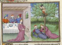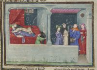 Parigi, Bibliothèque de l'Arsenal, 5070, f. 267v. Il copista del manoscritto è Guillebert de Mets. Lidia uccide lo sparviero di suo marito Nicostrato durante un banchetto; Lidia e Nicostrato conversano distesi in un prato, mentre Pirro è nascosto tra i rami di un pero.